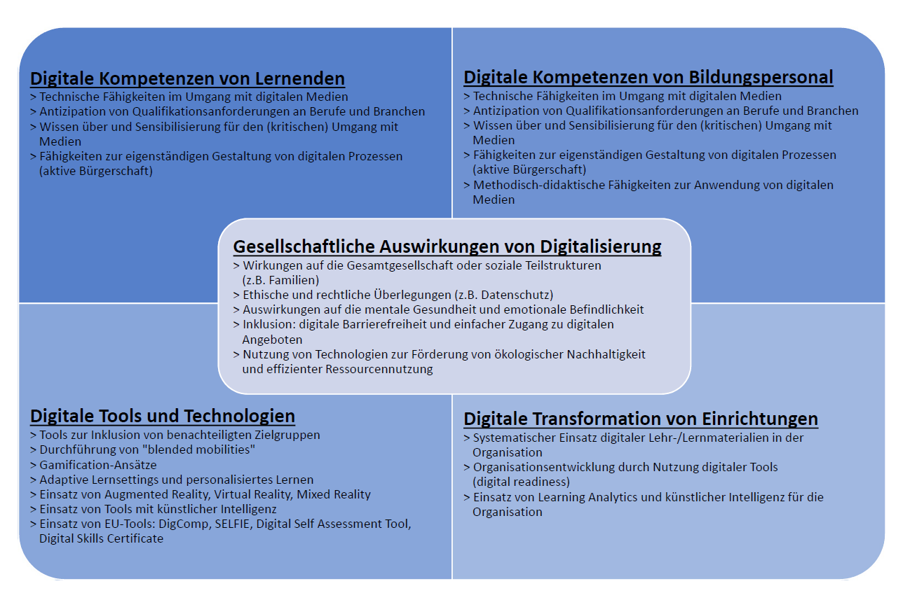 Um eine leichtere Einordnung für die Projekte zu ermöglichen, wurden die verschiedenen Themen und Betätigungsfelder der Projekte in Erasmus+ aus den letzten Jahren in fünf Dimensionen zusammengeführt. Sicherlich ergeben sich an der einen oder anderen Stelle Überschneidungen und Unschärfen, aber das folgende Schaubild soll Ihnen einen Überblick über mögliche Facetten und Schwerpunktsetzungen im Bereich der digitalen Bildung geben.